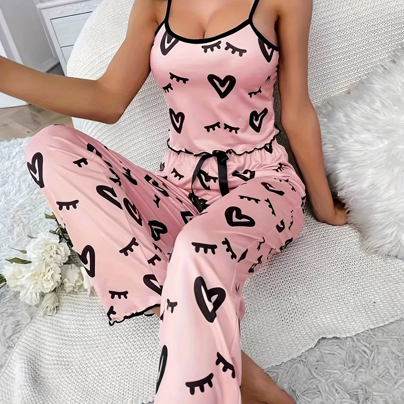 Printed heart, eyelash-trimmedcamisole and long pants leisurehomewear set made of milk silk.Two-piece set Fit Pajama Casual